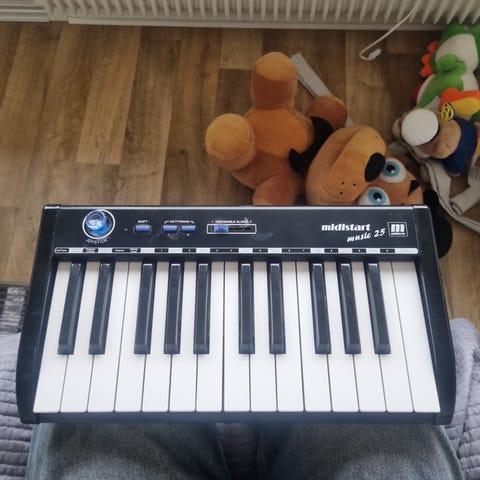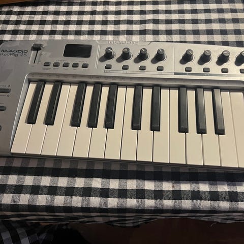 M-Audio Keystation Mini 32 MK3 är en MIDI-klaviatur med 32 tangenter. Den är svart till färgen och används för musikproduktion och digitalt ljudskapande.