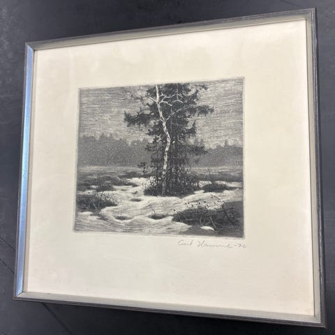 G. Willfors teckning föreställande ett landskap med träd och vatten. Konstverket är inramat och signerat av konstnären G. Willfors. Teckningen är utförd i svartvitt och visar en naturscen med detaljerade träd och en sjö.