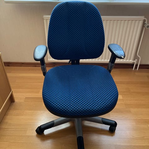 Artek kontorsstol i blått tyg, designad av Anders Pehrson. Stolen har justerbara armstöd och hjul för rörlighet. Sits och ryggstöd är klädda i blått tyg. Passar för kontorsbruk eller arbetsplatsmiljö.