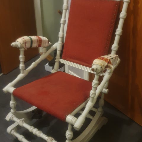 Vad jag vet, är det här en antik amerikansk gungstol i trä från sekelskiftet 1800-1900 med mönstrad beige klädsel i nyskick.