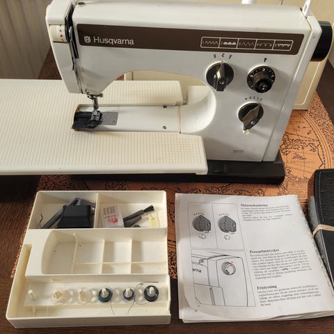 Husqvarna 2000 symaskin. Original väska, lådor med tillbehör, instruktionsbok. Servad 2006 men sällan använd efter det. Ärvt den men används inte.