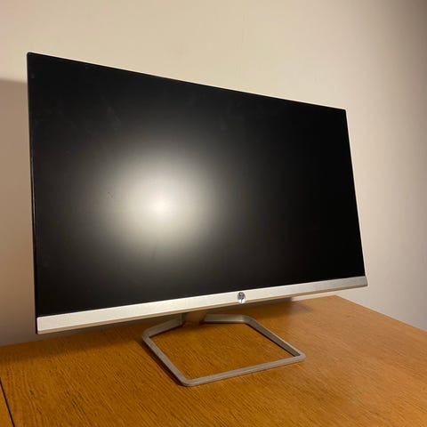 HP 24w bildskärm med en skärmstorlek på 24 tum. Skärmen har en vit och silverfärgad design och erbjuder anslutningar som HDMI och VGA. Passar för allmän användning och kontorsmiljöer.
