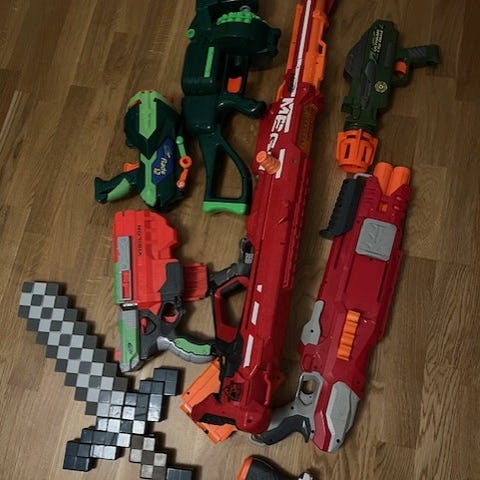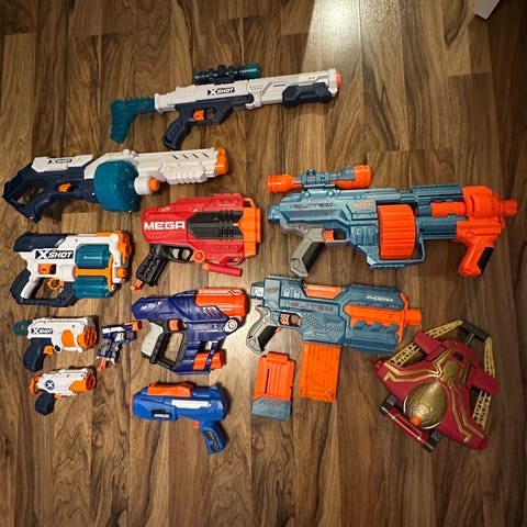 Nerf Elite med uppladdningsbara batterier samt batteriladdare.