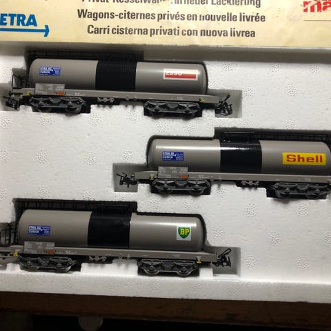 Märklin modelljärnväg med olika godsvagnar och tankvagnar. Setet inkluderar gula och röda godsvagnar samt gula och silverfärgade tankvagnar med Shell och Esso märkning. Vagnarna är detaljerade och avsedda för modelljärnvägssamlingar och modellbyggen.