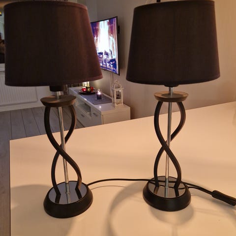 -Vikt: ca 1kg.-Kablar: ca 180cm.- Ej Ihopkopplade 2st.Strömbrytare finns på både fungerar utmärkt.-: Bruksanmärkningar en spricka på träet på ena lampan i fint skick i övrigt. Lamporna fungerar väl. Väl omhändertagna lampor