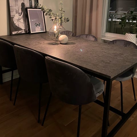 Stabilt men välanvänt. Vitt underrede och grå bordskiva. Oklart material. Nån typ av trä/ träskiva