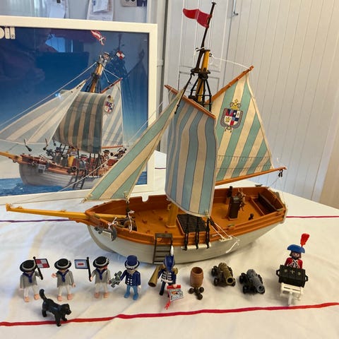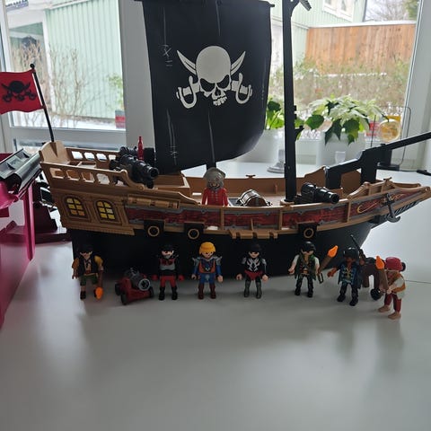 Underbart sjörövarskepp som står och glänser på en hylla som nu behöver ny lekkompis.