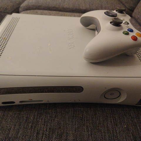 Microsoft Xbox 360 spelkonsol i svart färg. Konsolen har standardanslutningar för spel och tillbehör, inklusive HDMI och USB-portar. Den är avsedd för användning med Xbox 360-spel och tillbehör.