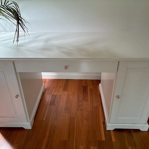 IKEA skrivbord i vitt. Skrivbordet har en låda och ett skåp för förvaring. Passar för kontors- eller studiemiljöer.
