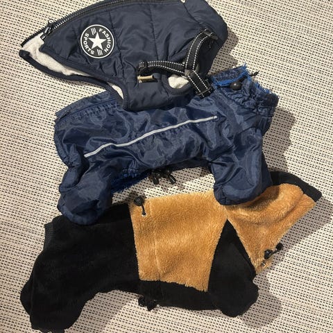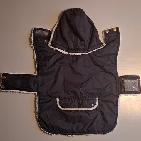 Hundjacka i storlek S tillverkat av 100% polyester med grön utsida och mjukt, vitt foder. Täcket har öppningar för benen och knäppning med tryckknappar. Säljer pga hunden är för stor. Har aldrig använt