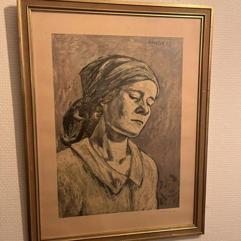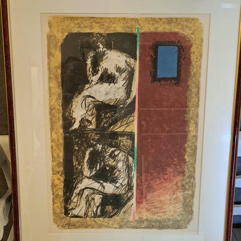 Litografi av Hjördis Lindblad med abstrakt motiv som visar flera ansikten i olika riktningar. Inramad med en silverram. Passar för inredning och dekorativa ändamål.