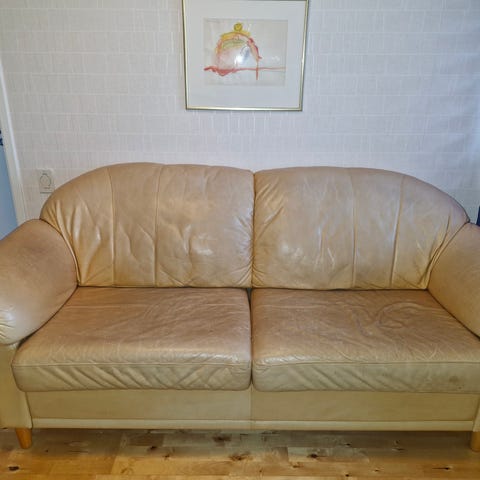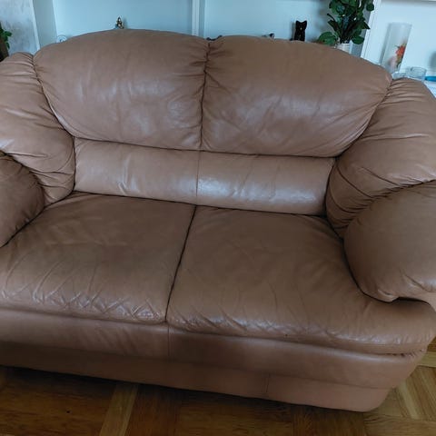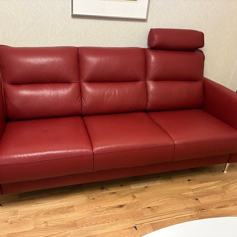 3-sits soffa i skinn med integrerade fotpallar (utfällbara). Bra skick.