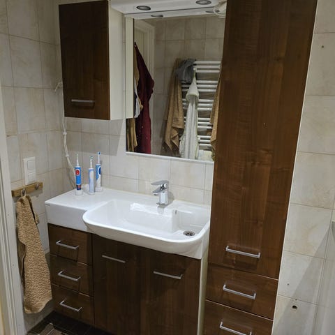 Mått handfat+kommod 105 cm brett, 52 cm djupt (högsta måttet) och 68 cm högt.