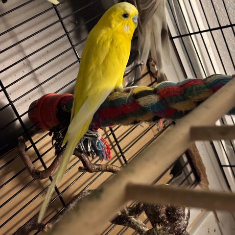 De är i dagsläget inte tama, men med tålamod och tid finns alla möjligheter att vinna deras förtroende. Hanen har lite svårare att flyga, men han rör sig obehindrat i buren och är en glad och social kille trots det.