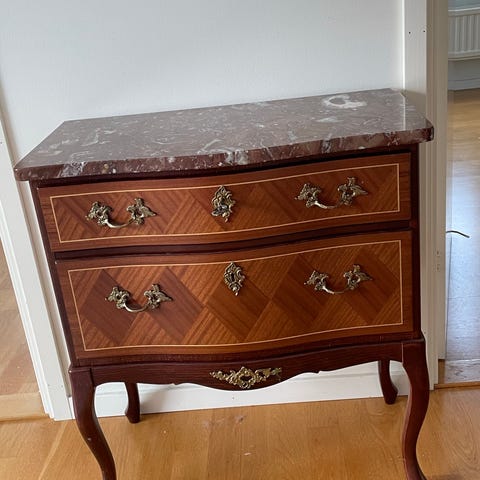 Stor fin gustaviansk byrå med 3 lådor i mahogny och intarsia och skiva i marmor fint skick se bilder.
