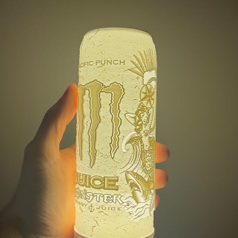 En unik, 3D-printad lampskärm designad som en Monster Energy-burk.