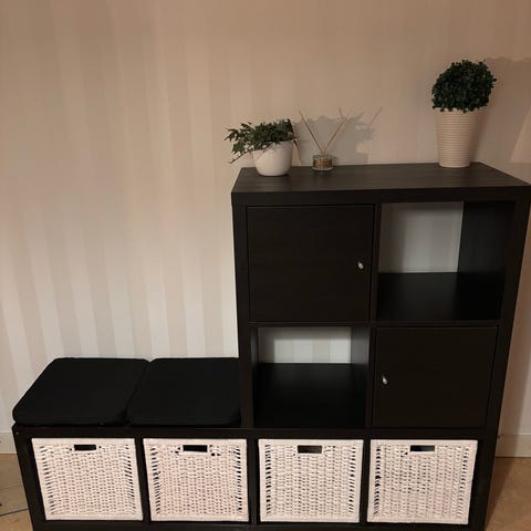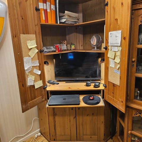 Vitt hörnskåp, finns 1 nyckel som passar bägge dörrarna. Inte särskilt tungt men man behöver ändå vara två då det är otympligt att bära. Finns på bottenplan.
