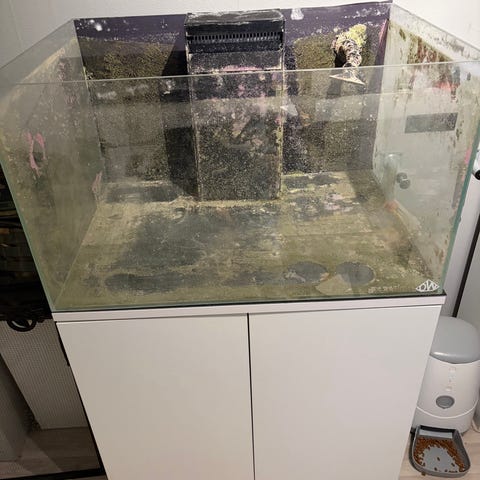 Akvarium med belysning och tillhörande skåp. Akvariet innehåller dekorativa element som stenar och grottor. Passar för inomhusbruk och kan användas för olika typer av sötvattensfiskar.