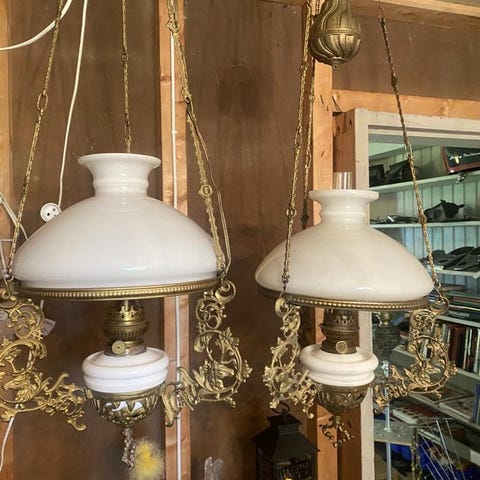 Lampan har mässingsdetaljer och glasbehållare både upptill och nedtill. Dekorativ inredningsdetalj i exempelvis vardagsrum, sommarstuga eller lantligt hem.