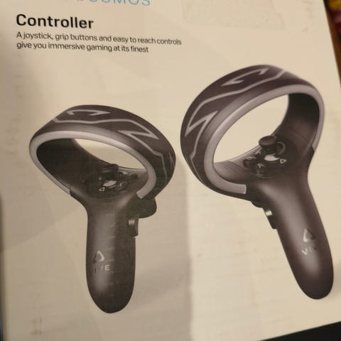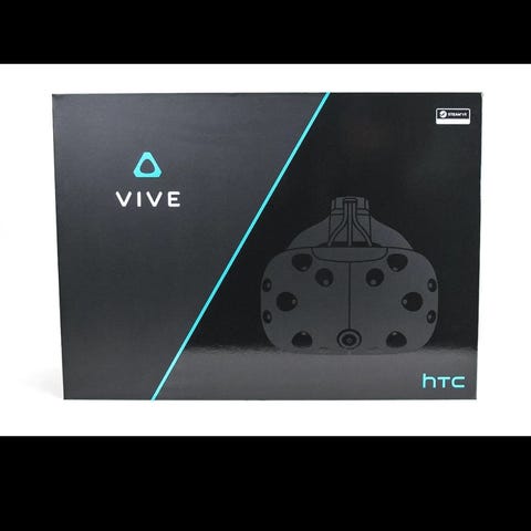 HTC Vive 1.0 VR-headset inklusive två handkontroller, laddare, kablar och sensorer.
