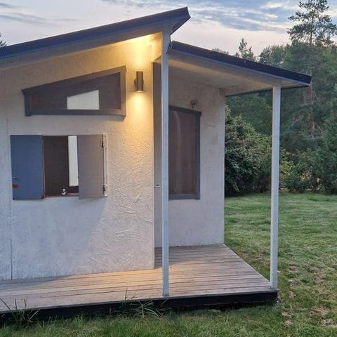 Innehar loft, full ståhöjd för vuxen, platsbygda bänkar & bord finnes, isolerad 45x95-stomme, plexifönster, ekparkett.