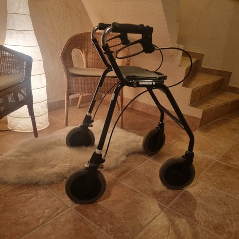 Gånghjälpmedel tillverkat i metall. Designad för att ge stöd och stabilitet vid gång. Utrustad med justerbara ben för anpassning till användarens längd. Lätt och smidigt stöd, gör det enkelt att ta sig fram.