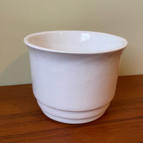 Grå-grön kruka av keramik. Knappt använd. Lite missfärgningar i färgen (se bilder). I övrigt i bra skick. Går att vända så att det inte syns.