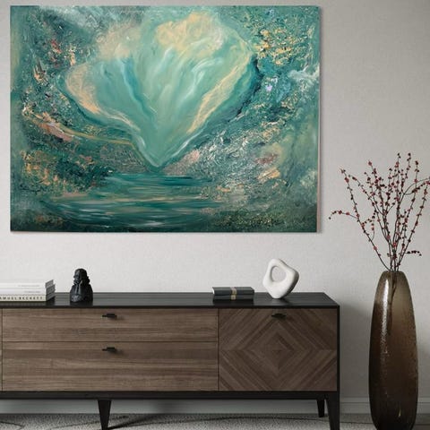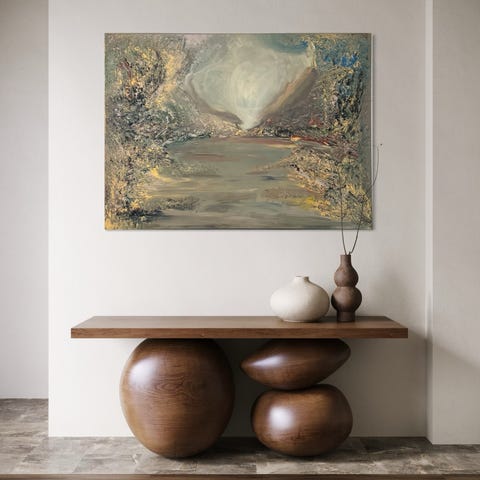 Konstnärsnamn akrylmålning föreställande ett landskap. Målningen har dimensionerna 110x150 cm och är utförd på duk. Färgschemat domineras av gröna och blå nyanser med texturerad yta.