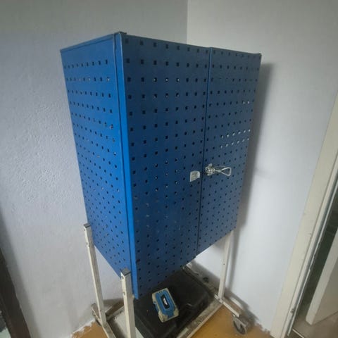 Verktygsvagn i blå metall. Skåpet har två dörrar med perforerad design och är lämpligt för förvaring i olika miljöer. Passar för organiserad förvaring av verktyg, och andra föremål.