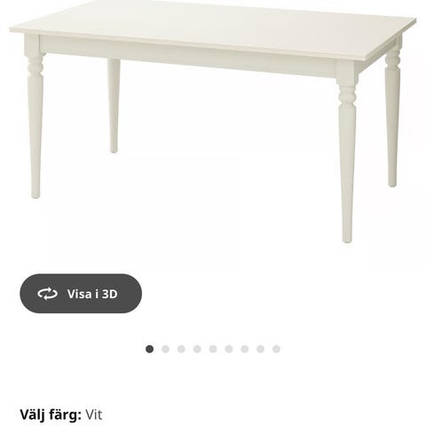 Vit matbord. Bordet har en rektangulär form och är gjort av trä. Stolarna ingår ej. Köpt på Folkhemmet 2018. Iläggskiva ingår.