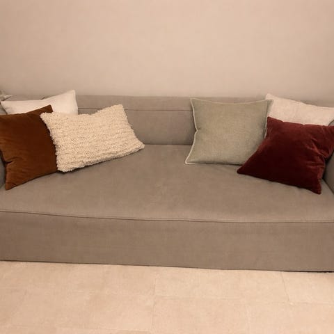 Tyg: Mörkgrå velour/sammet, modellen heter Classic Velvet Anthracite – slitstarkt och tvättbart. Alla kuddar är nytvättade. Soffan kommer från ett djur- och rökfritt hem.