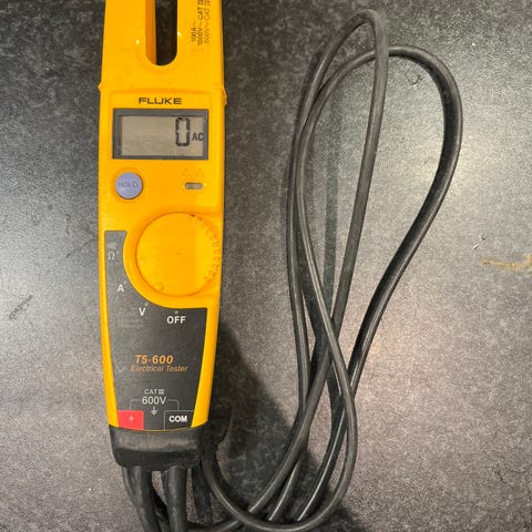 Fluke Multimeter Digital med gul och svart färg. Inkluderar testkablar för mätningar. Används för elektriska mätningar och felsökning.