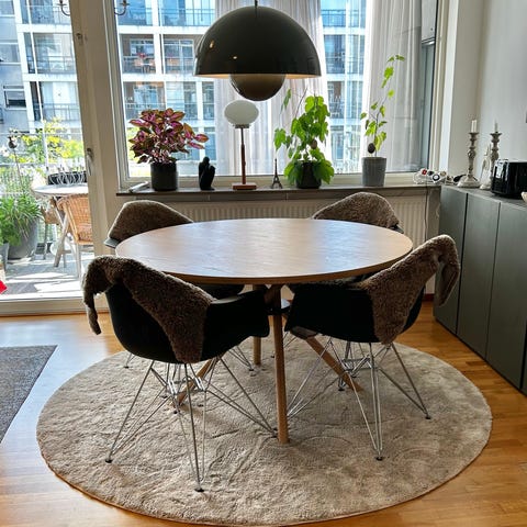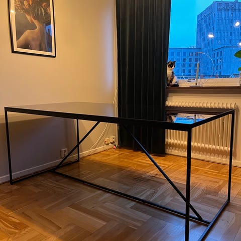 Ilva Jørgen Gammelgaard matbord med bordsskiva i glas och stomme i metall. Bordet har en modern design och passar för matsals- eller köksmiljöer. Bordet har ett inbyggt tilläggsskiva som är 75cm, inbyggt på ett snyggt och smidigt sätt under bordet. Matgruppen är köpt för 32 000 kr för 5 år sedan, nu säljs för 5500kr