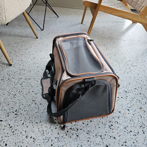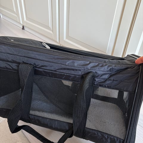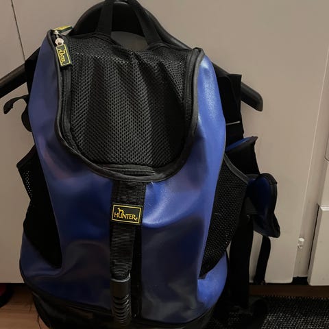 Hundväska i bomull från Hunter i färgen olivgrönt. Bärväskan är utrustad med avtagbar axelband, ventilationsnät uppe och ett på sidan (går ej att öppna det på sidan) och 3 olika fack. Finns även en tillhörande bajspåseväska till som fästes med karbinhake. Väskan har även ett stabilt inlägg i botten i imiterad lammskinn som är tvättbart.
