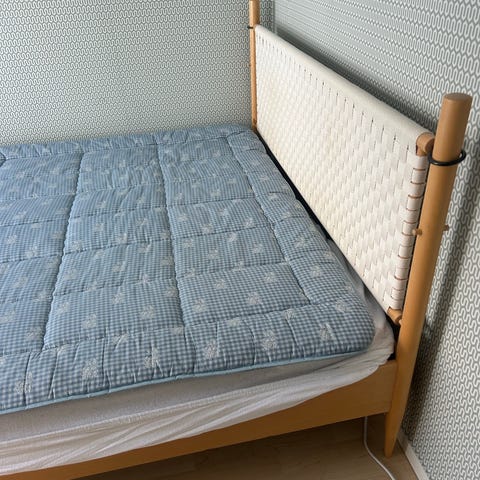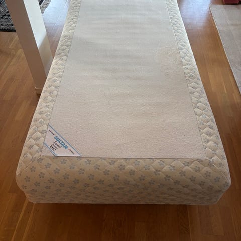 IKEA Sultan Silsand sängram och madrass med trästomme och tygklädsel.
