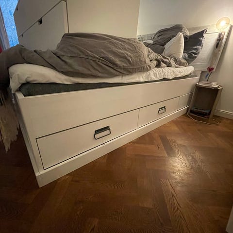 Sängen hämtas som en del och den väger en hel del.. Ni behöver vara minst två bäldigt starka personer som bär!