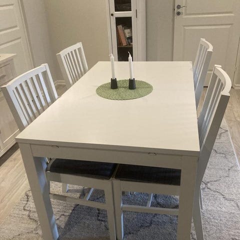 Matbord med fyra vita stolar