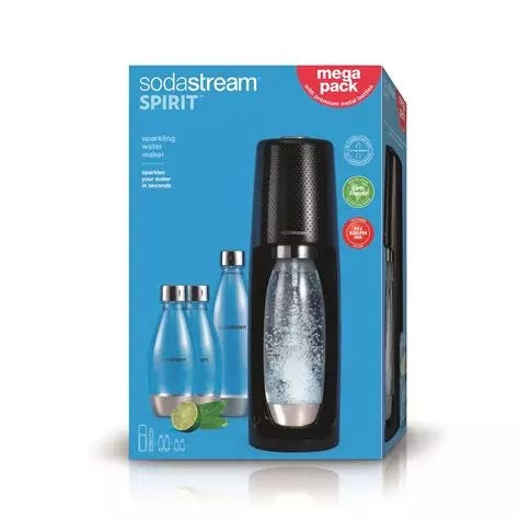 Clas Ohlson Sodastream kolsyremaskin i svart färg. Används för att kolsyrat vatten hemma. Inkluderar två återanvändbara flaskor för kolsyremaskinen.