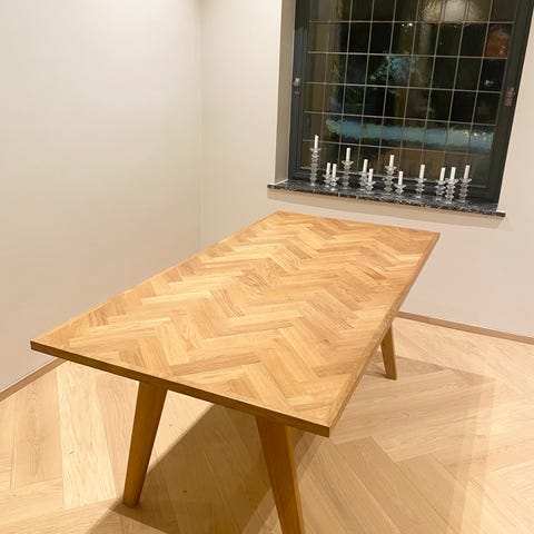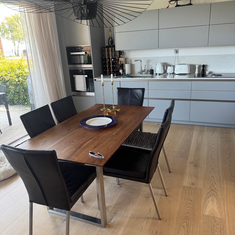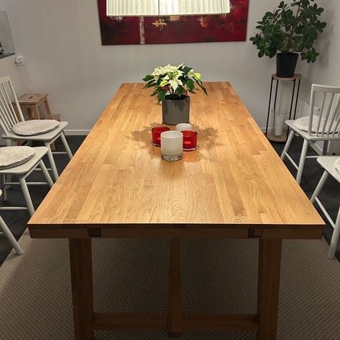 Matbord, bänk samt stolar i mattlackerad ekfanér (serien Landholm)