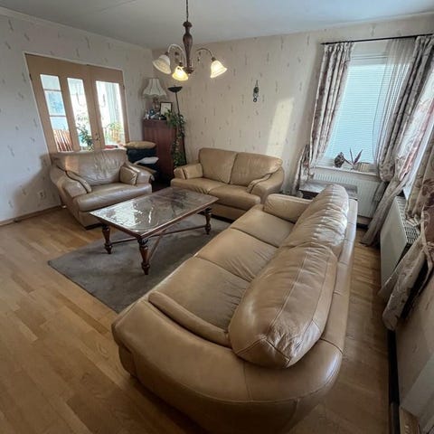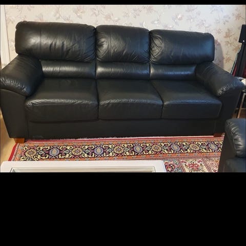 Soffgrupp bestående av en 3-sits och en 3-sits soffa i svart läder. Passar för vardagsrum eller andra sittutrymmen. Materialet är läder vilket ger en slitstark och lättskött yta. Hem körning ordnas för rimlig pris