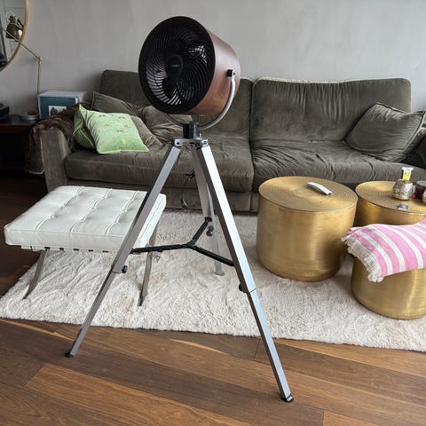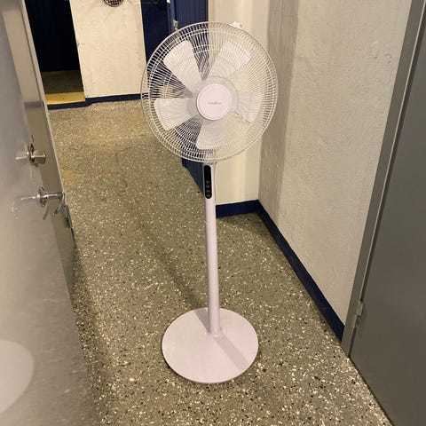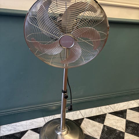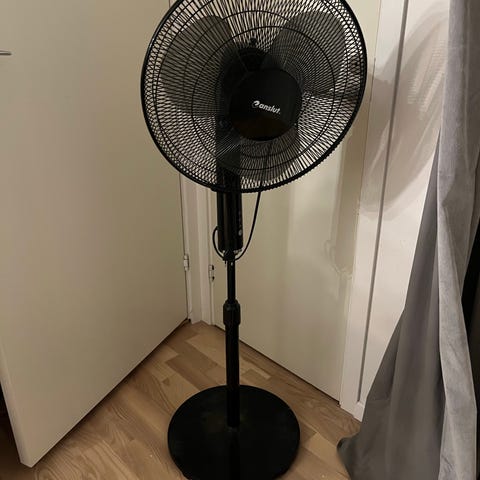 Golvfläkt i svart färg med justerbar höjd och flera hastighetsinställningar via knappar på stången. Fläkten har ett skyddsgaller runt bladen. Fungerar fint.