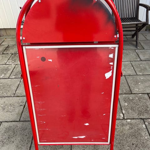 Stabil metallskylt för butik, café eller restaurang. Helt ny, aldrig använd. Perfekt för att visa meny, erbjudanden eller reklam. Ihopvikbar och tar på så sett inte mycket plats. Relativt lätt jämfört med större trottoarpratare.