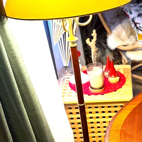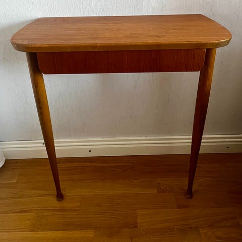 Väggspegel i teak med rektangulär form med en sidolampa med vit skärm. Spegeln har en stabil träbas och är avsedd för väggupphängning. Lampan är placerad på en sida av spegeln och ger extra belysning. Bredd 62 cm, höjd 52 cm (inkl hylla). Skickas ej.