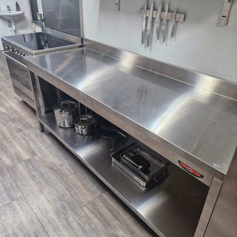 Rostfri arbetsbänk med en hylla under bordsskivan. Bänken är tillverkad i rostfritt stål vilket gör den hållbar och lätt att rengöra. Passar för användning i kök, verkstäder eller andra miljöer där en stabil och lättskött arbetsyta behövs.