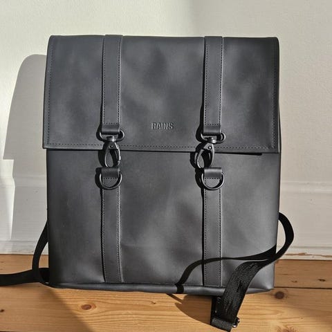 Svart Rains ryggsäck i fins skick. Mindre repor på hakarn. Vattentät. Laptopfickan passar en 13-tums bärbar dator med fodral.