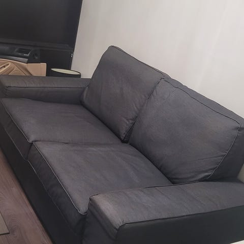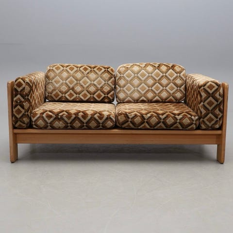 IKEA Aage Petersen soffa i grått tyg. Soffan har två ryggkuddar och två sittdynor. Designad av Aage Petersen. Passar för vardagsrum eller liknande miljöer.