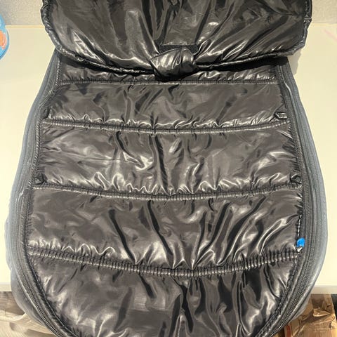 Kan dras över ryggstödet om det går. Funkar även i liggdel. Sitter kvar väldigt bra i vagnen pga stora antiglidskydd på bakstycket.