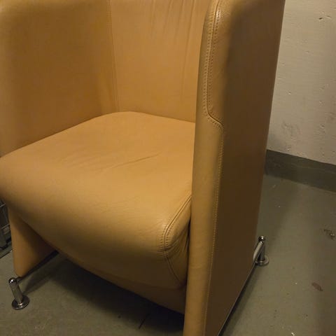 Bruna läderfåtöljer med matchande fotpall i brun färg. Fåtöljen har stoppad sits och ryggstöd med knappdetaljer. Både stolen och Fotpallen har rundad träbas. Materialet är läder och trä.