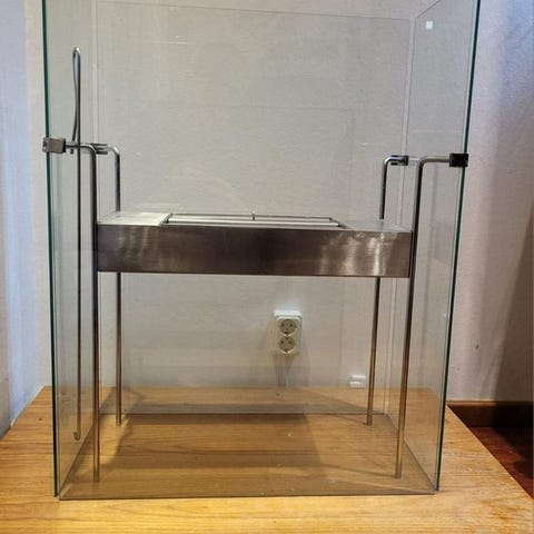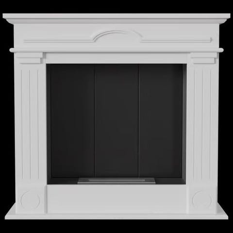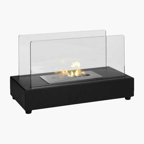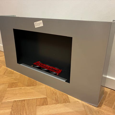 Bioetanolkamin med inbyggd vedförvaring i nederdelen. Kaminens design inkluderar en rundad överdel och en svart eldstad. Används för uppvärmning och som dekorativ inredningsdetalj.