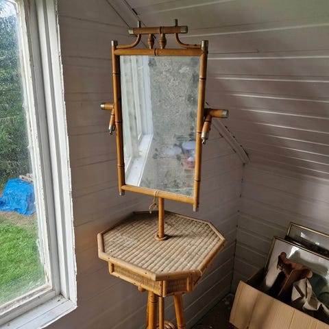 Just nu är upphängnings anordning att spegeln hängt på sidan över skåp men gammalt hål finns om man som på bilden vill ha den stående